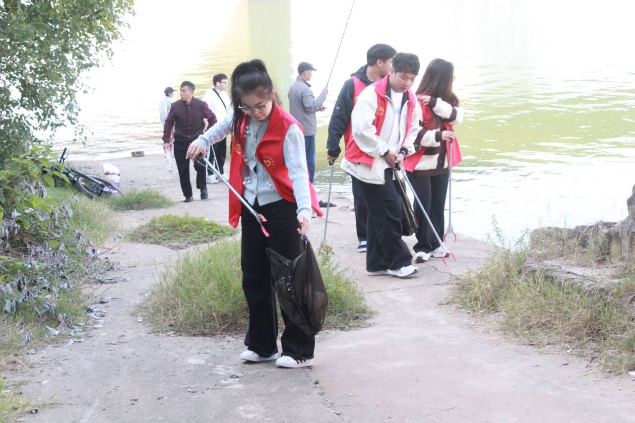 辅导员老师与青年学生党员组织开展志愿服务活动,清理母亲河周边的生活垃圾,维护清洁水源,共建绿色家园。