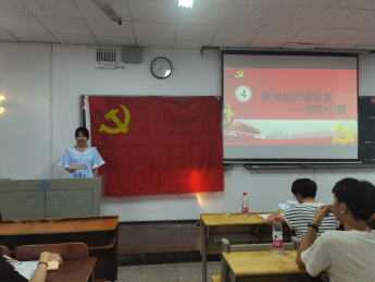 接着,新党员宣誓,老党员重温入党誓词,在支部书记李老师的领誓下,全体党员面向党旗,举起右手庄严宣誓,慷慨激昂,对党和人民作出庄严承诺。随后新党员代表欧阳小丽同志上台发言:“作为一名新党员,要始终牢记共产党员的初心与使命,坚定信仰信念,以更高的标准,更严的要求,奋力谱写中华民族伟大复兴的新篇章。”最后,支部书记李翠新老师对活动进行总结,希望党员能够知行合一,参照现实推动工作,身体力行为群众办实事,雷厉风行主动担当,行甚于言,用行动服务人民群众。
